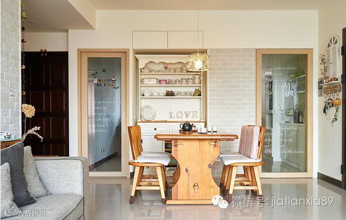 实木桌椅的摆设让餐桌领域多了份原始美感,吊灯与后方餐柜的安排,增添柔美的清甜气息。