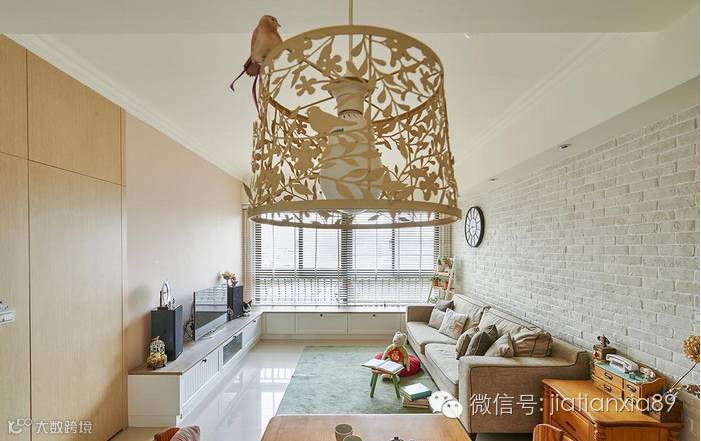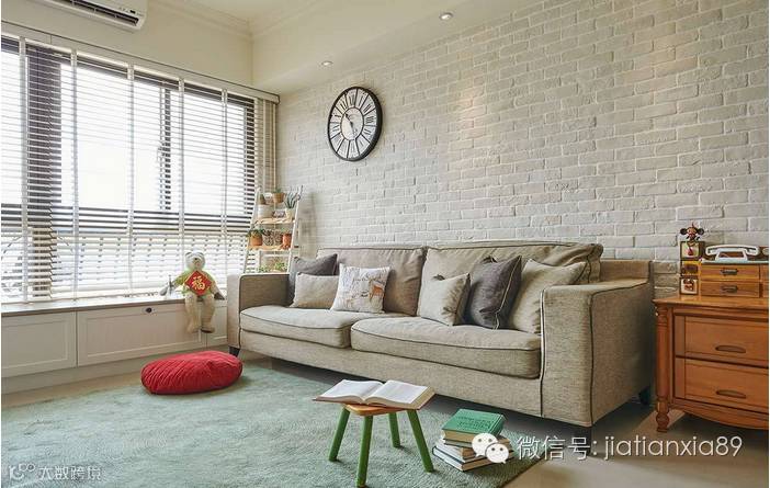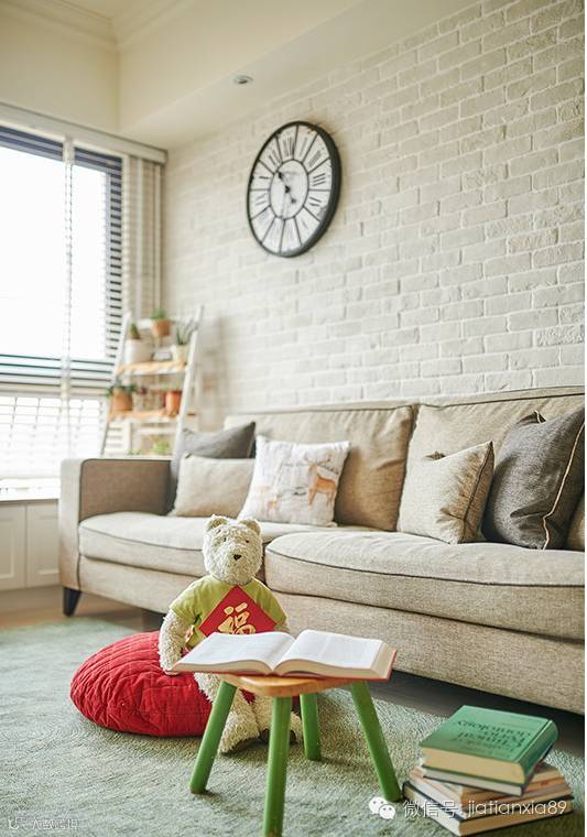 以文化石铺陈沙发背墙,铁件时钟装饰其中,让日系杂货风的空间多了一股原始美感。
