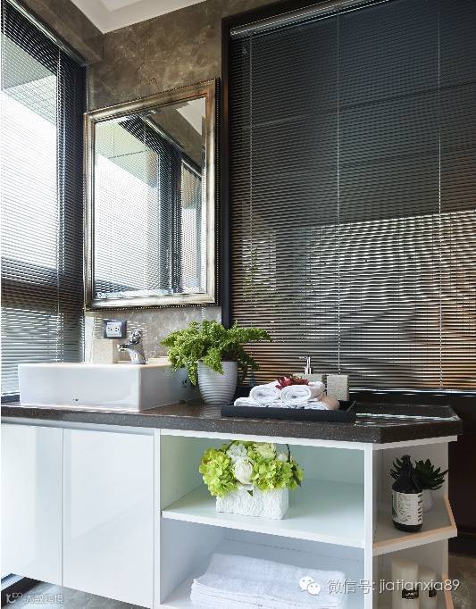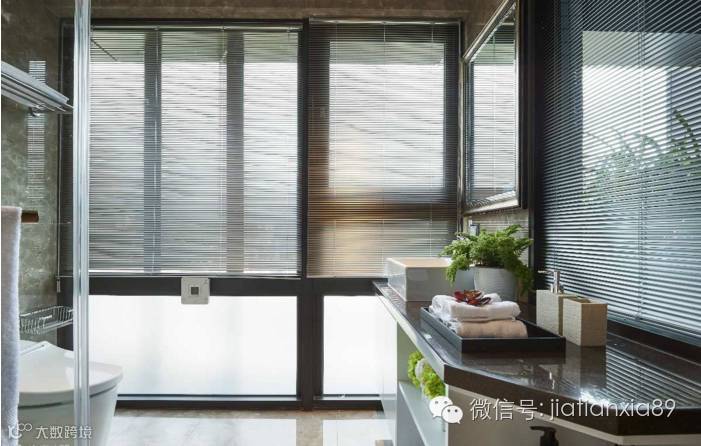 窗户透过百叶窗的方式调节光源,纳入充足的自然光可让卫浴空间更显干净、自然。