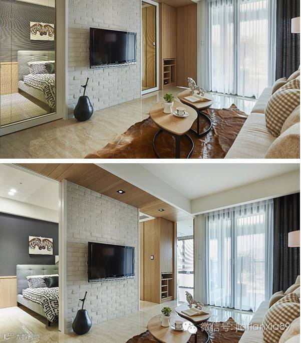 电视墙以文化石作为视觉风格,透过推门的设计框出卧室空间,藉由铝百叶的安排让卧室保有个人隐密性。