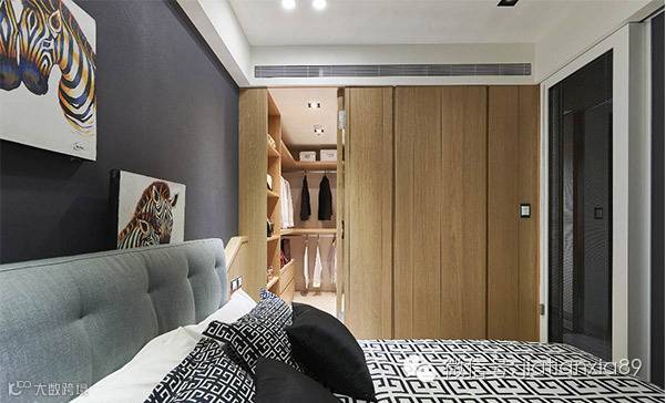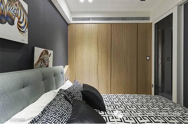 床头以深色壁纸作为铺陈,其中饰以狂野的斑马意象,替简约的空间注入原始生气。