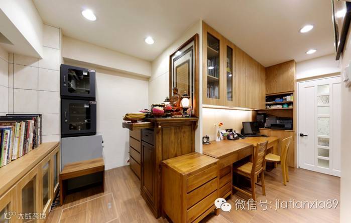 在工作区一侧,设计木质柜体的佛堂,蕴含着传统美学与慎终的思维。