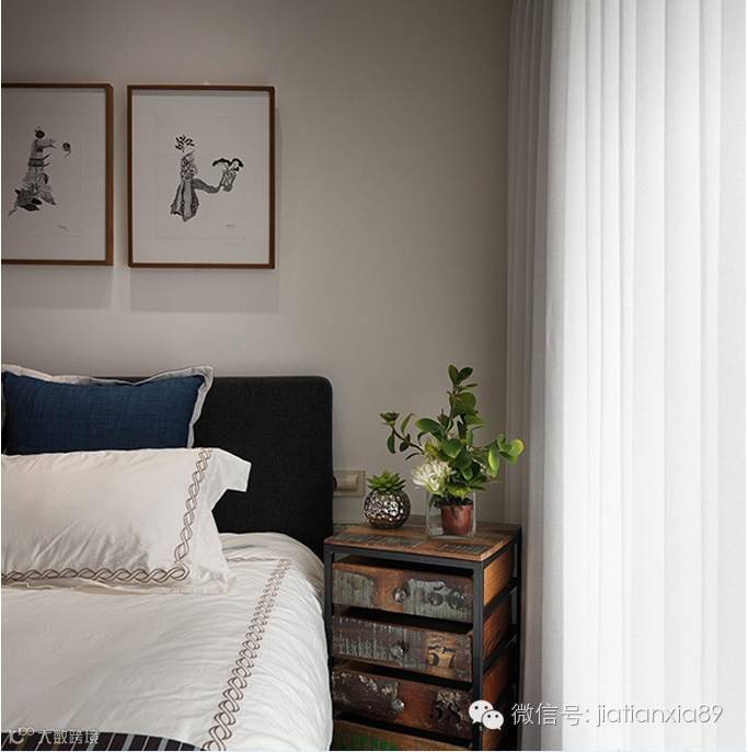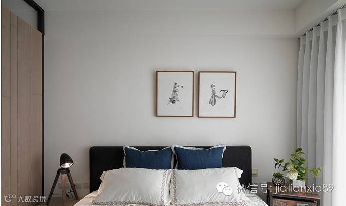 无多余的点缀,大面留白的墙面悬吊两幅挂画,还原卧眠空间该有的纯粹简单。