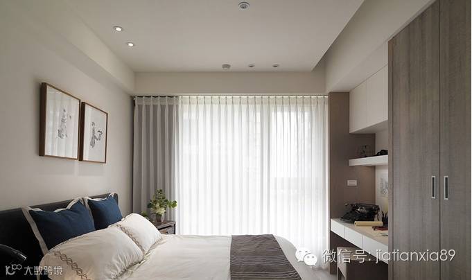 满盈日光穿透窗纱照入室内,在白色系主卧房中洒落温暖的阳光。
