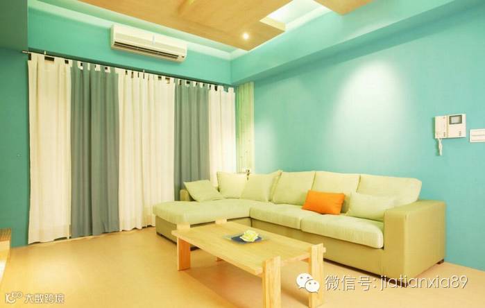 客厅的粉绿色L型沙发、衬上实木茶几桌、与优雅的素面落地窗帘,柔美协调的营造出客厅的温暖气氛。