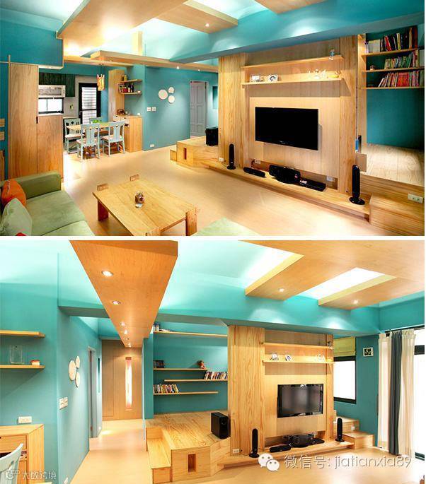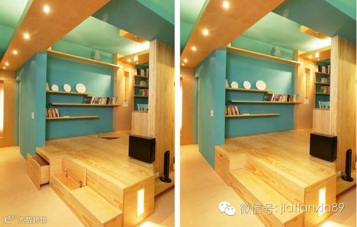 书房区以实木架高成收纳型地板,立在与客厅之间的功能造型墙,一侧是书桌、另一侧是客厅的视听设备。