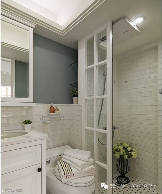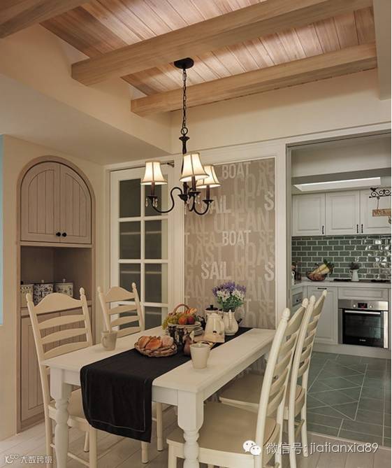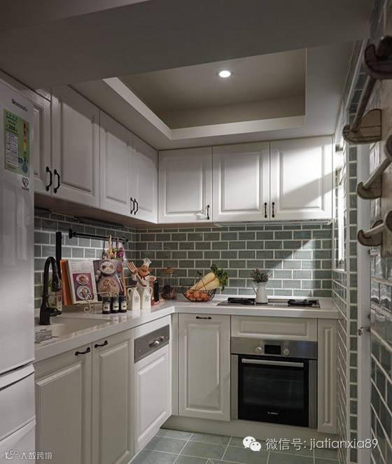 厨房饰以砖瓦墙面,搭配白色橱柜,空间以淡灰蓝妆点,组合优雅动线,将地中海民族色彩发挥极致。