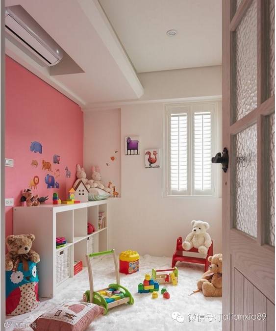 女孩房则用粉色情调加以演绎,空间内摆放各种毛绒玩具,满足女孩的爱美和打扮心理。