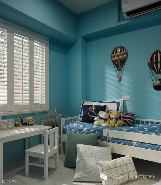 男孩房采用蓝白色调,经典的地中海色系搭配,揉入航海元素,迎合男孩的爱玩天性。