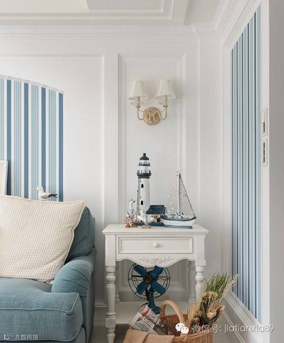 沙发背景墙两侧规划金器壁灯,再铺以蓝白相间竖纹墙纸,于桌台摆放航海元素物件,塑造摇曳时的临场感。