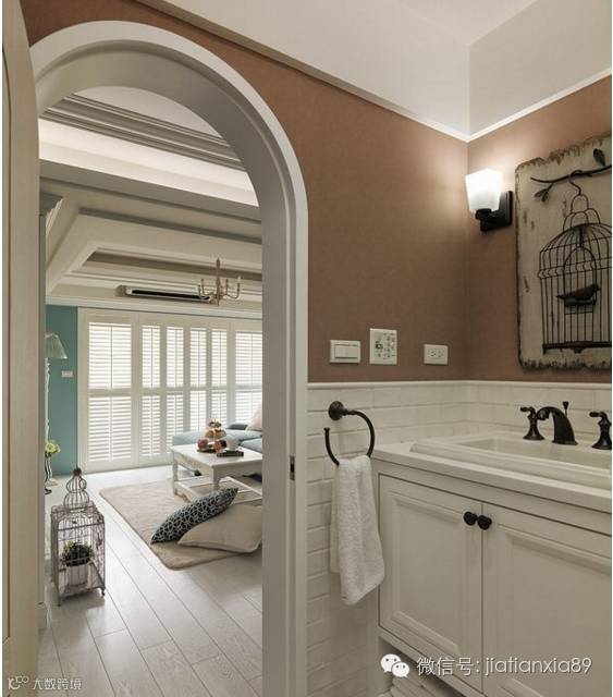 拱门处接连盥洗区,墙面以可可色调制,规划层次分明的功能区域,黑色铁件卫浴组合,进一步升华地中海风。