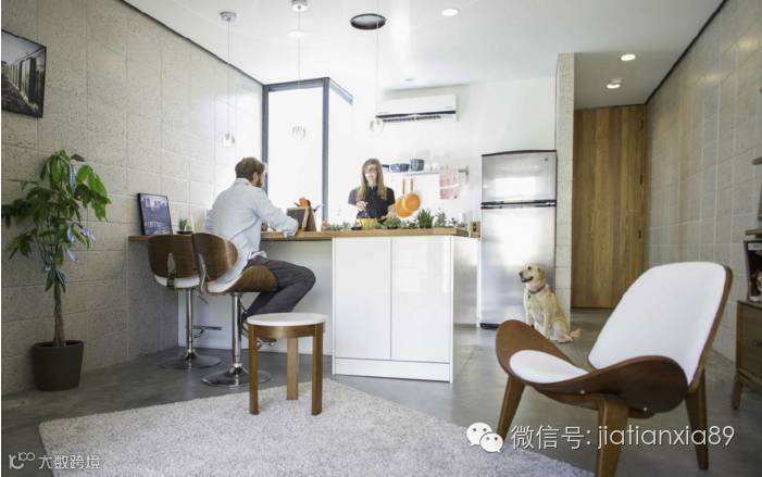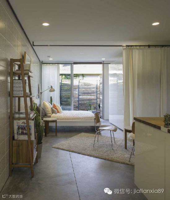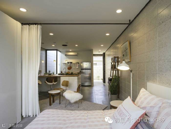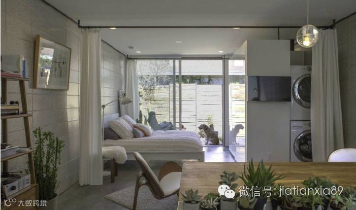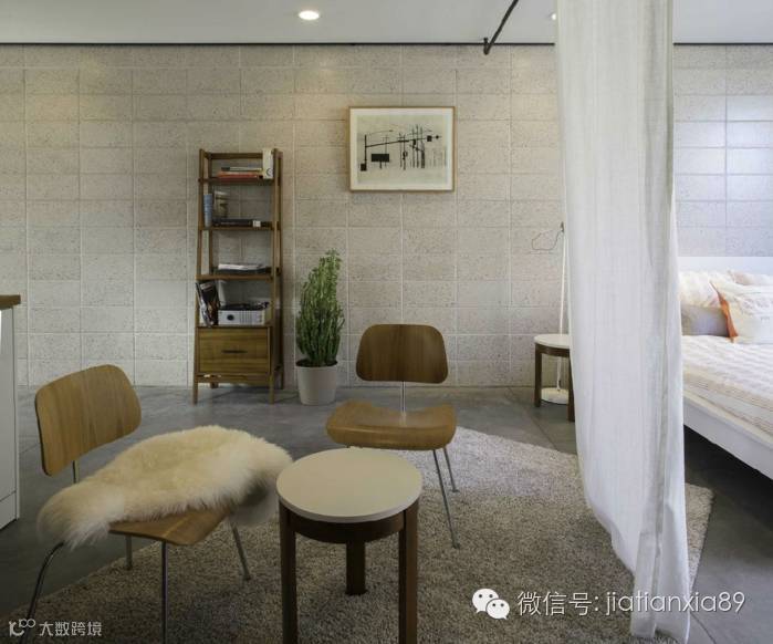 设计师打破传统的功能空间界定,将卧室和洗衣机搬到客厅,打造全方位开阔自由的居住感受。