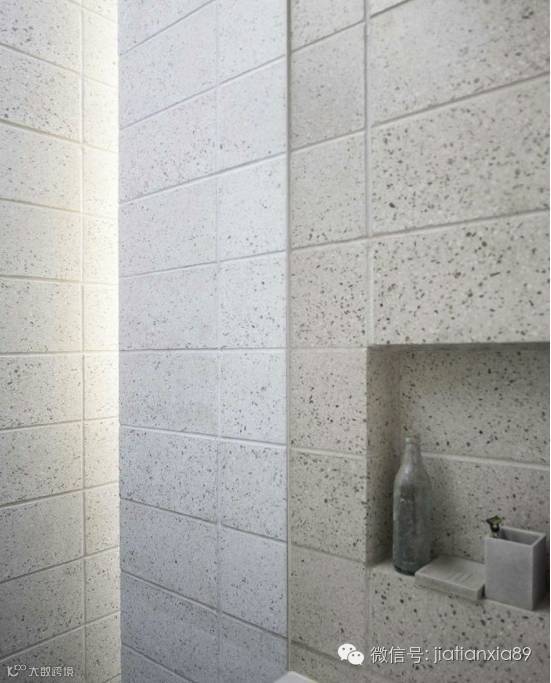 墙面以灰色系瓷砖堆栈,提升整体空间质感,嵌入式收纳空间可放置沐浴盐等用品,营造舒适效果。