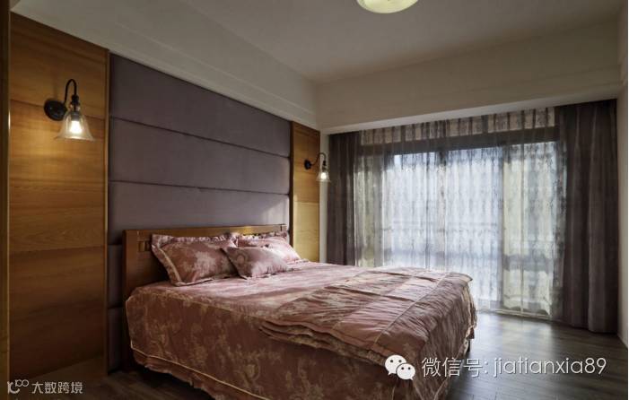 为偶尔回家探视留宿的儿子预留歇息空间,以浅紫色绷布床头柔和设计表情。
