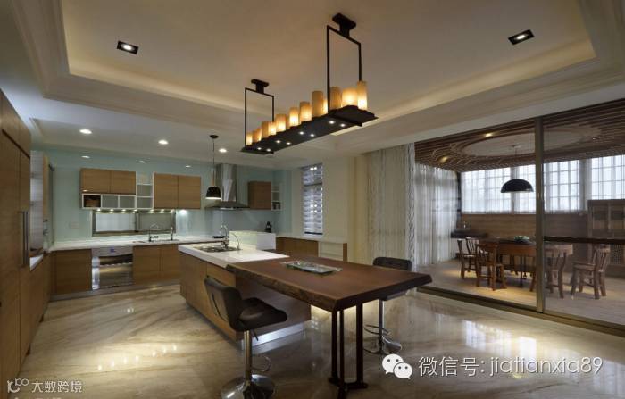 设计师接续中岛线条,采用无修边的实木增添轻食吧柜的功能。