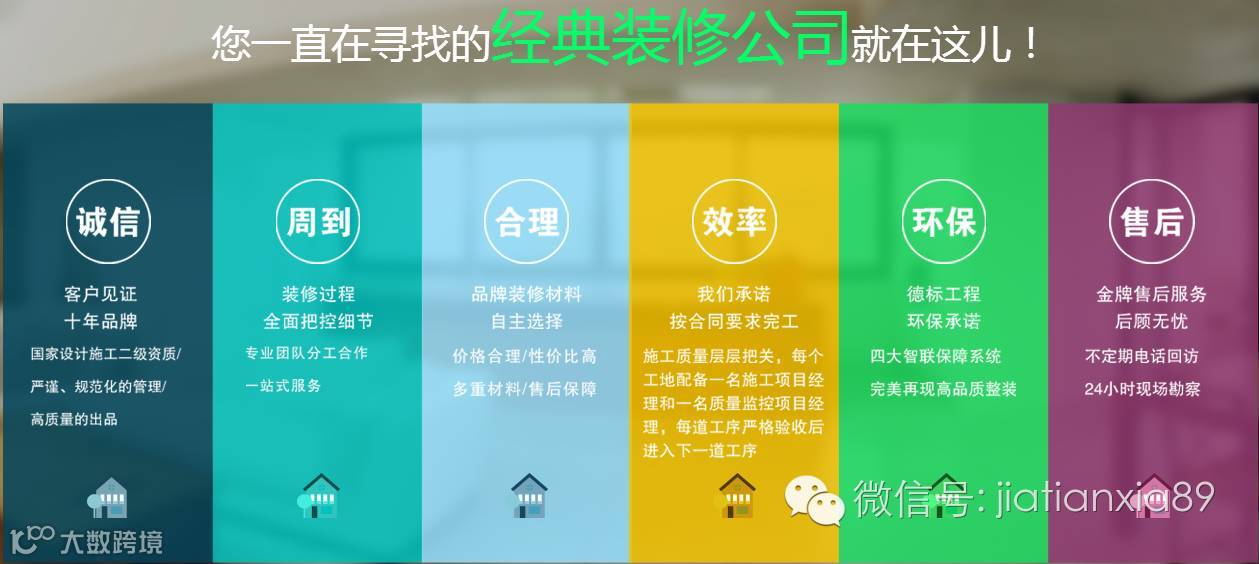 公司秉承“诚为基、和为贵、拼为魂、家为大”的企业精神,打造最完美的家装工程,为客户提供最优质的一站式服务。