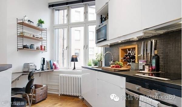 厨房尽头是三扇大窗户,向客厅稍微倾斜,也使得客厅与厨房能共享室外阳光,窗明几净,让人心情愉悦。