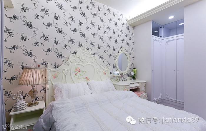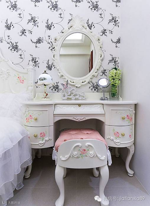 以现成家具满足女性每天梳妆打扮的需求,造型语汇呼应床头设计,皆充满古典美。