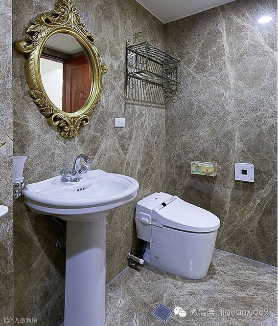 维持原来建商附设的卫浴设备,以复古华丽感的古铜金镜面装饰,塑造视觉亮点。