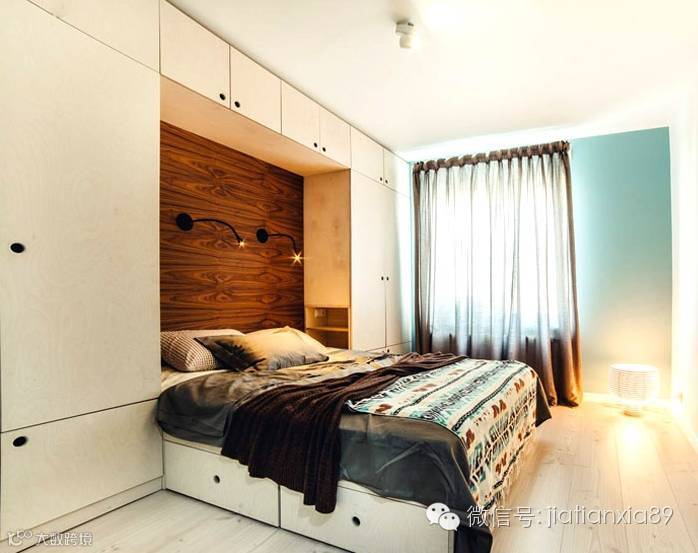 主卧室跳脱传统设计,内嵌式床头饰以波浪木纹,四周则为功能强大的收纳柜体,更增加趣味光氛创意。