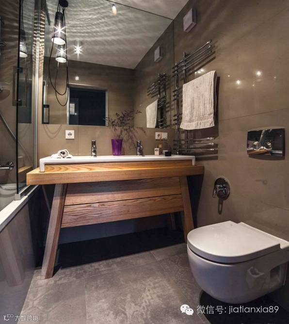 功能分区紧凑不臃肿,暗色调地板与墙面延展视线,加上各种创意收纳设计,为屋主带来舒心的卫浴享受。