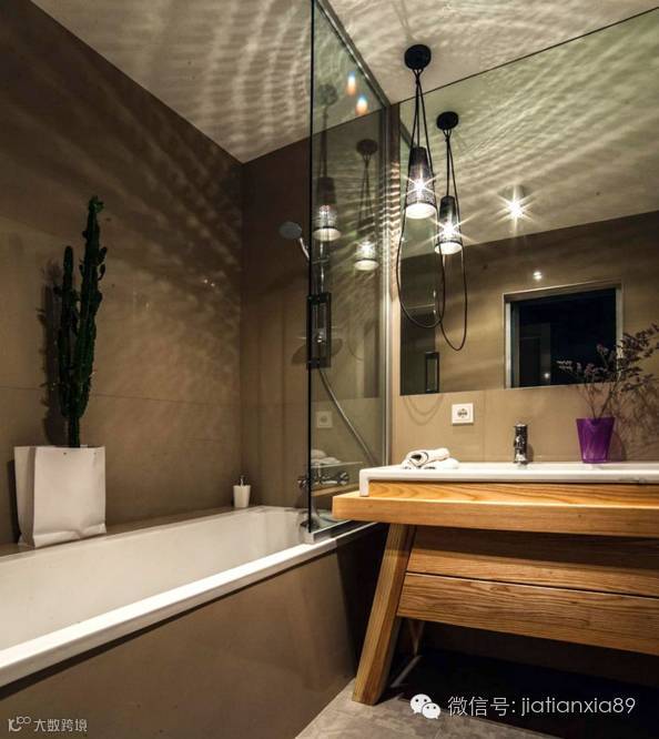 冷衫制作的木质盥洗台,将自然延伸到休憩放松的卫浴空间,架高的浴盆打造出色的干湿分离。