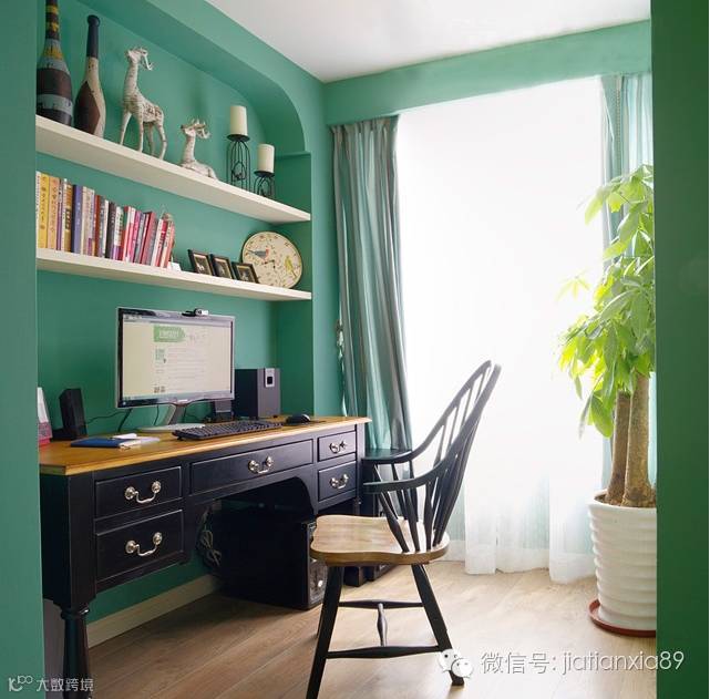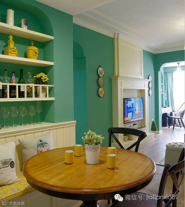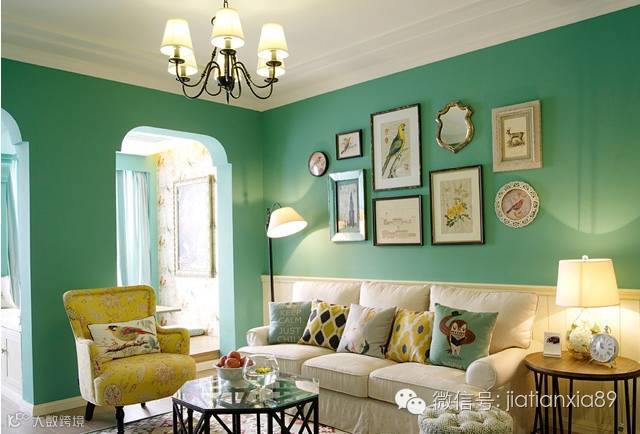 蓝绿色充斥在房间内,既体现出清新气质而又绚丽夺目。暖色调的美式布艺沙发在蓝绿色的包围中,呈现出休闲、舒适的温馨感。