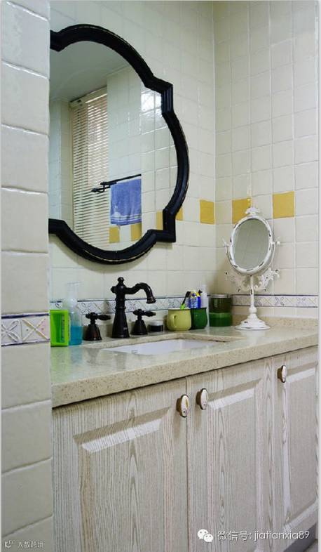 洗手间则是用白色的瓷砖,洁白干净,复古的镜子和水龙头精美别致,旁边摆放的一面宫廷镜很典雅,主人对生活的精致追求通过这些小细节展现得淋漓尽致。