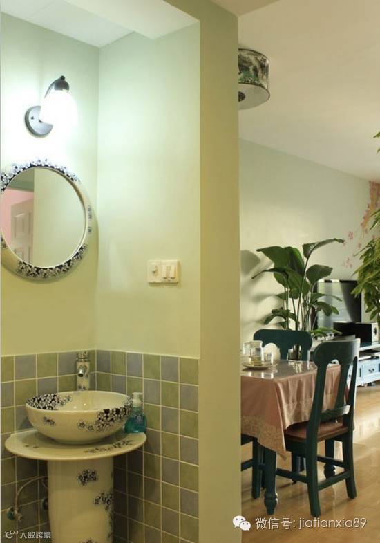 青花瓷的美让洗手间也别样的清秀美丽,特别是青花瓷镶边的浴室镜,简直美腻了。