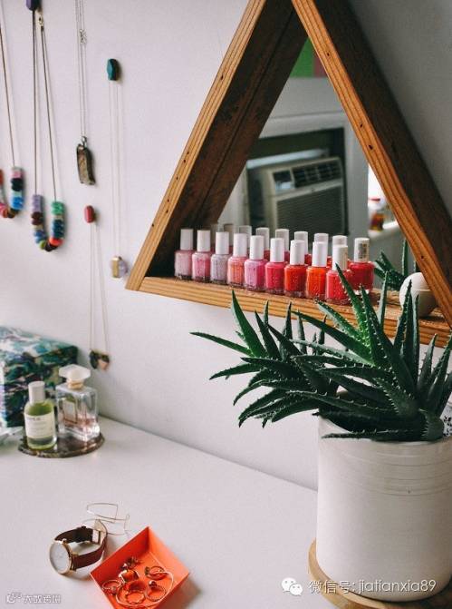镜子不仅经济实惠,而且造型百变,稍微改造设计,往往能带给你意想不到的效果。客厅墙面上奇特的三角镜配上五彩缤纷指甲油,镜子如水面般反射出了生活中的种种细节,让苍白的墙壁充满了生命的律动感,感觉不再单调。其实你不知道,每一面镜子都有一个故事。
