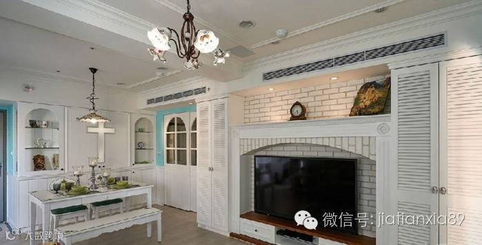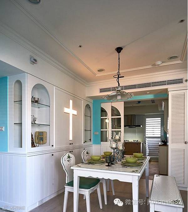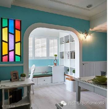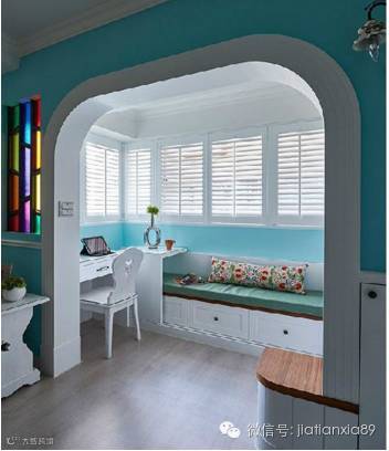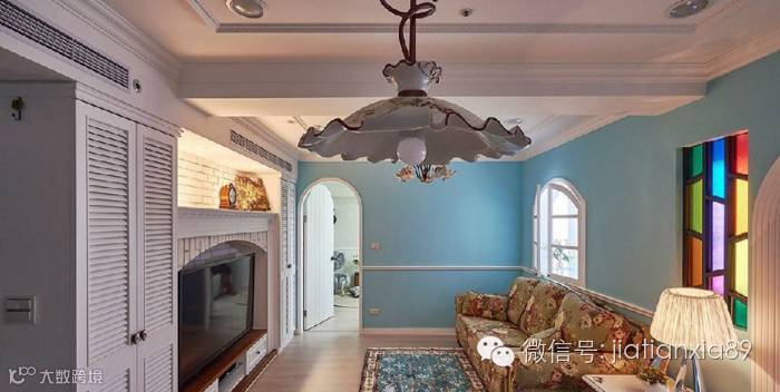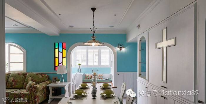 本案以屋主女主人偏爱的乡村田园风格为主轴,因此,在空间中可看见运用大量的圆弧拱门元素于柜面、门片、窗框的设计上,弧形线条使空间更为柔和细腻,同时也寓涵事事圆融之意;空间的整体色调以鲜明的蓝、白色系为主,局部搭配文化石墙、小碎花家具摆饰、七彩玻璃窗等元素,形象塑造了活泼到位的乡村田园氛围。