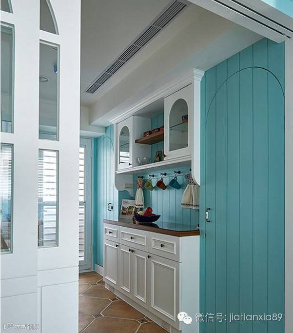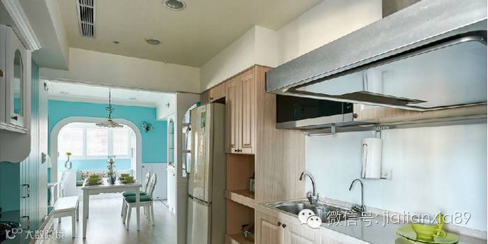 蓝、白色系的色调搭配延续至厨房区域,维持整体一致的设计风格。