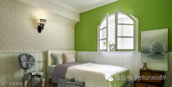 主卧房同样以乡村田园风为设计主轴,选用活泼的草绿色让场域跳出独特性,再搭配精心选搭的小碎花壁纸与造型壁灯,描绘出可爱梦幻的乡村田园氛围。