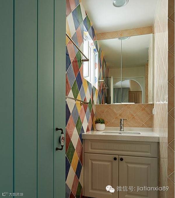 客用卫浴的视觉表现上,以缤纷多彩的砖面拼贴手法,赋予活泼趣味的空间表情。