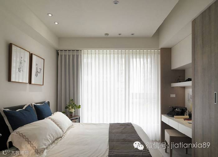 满盈日光穿透窗纱漫入,在白色系主卧房中洒落温暖光氛。