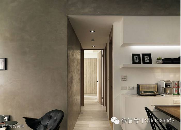 磐多磨立面越过墙角转折延伸入廊道墙面,连接公私领域,并透过色系延伸拉长空间视野。