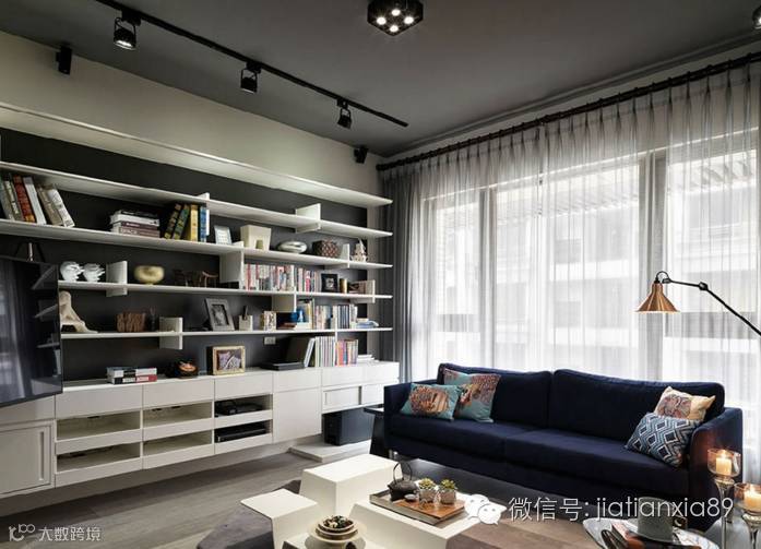 沿墙规划的大面书墙采木作与铁件增加负重力,让架上藏书与照片、收藏艺品丰富生活温度。
