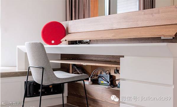 阅读区域,在打开封闭格局后,以书桌结合电视墙的半隔间量体,为喜爱音响的男主人规划好线路维修组装的收纳配置。