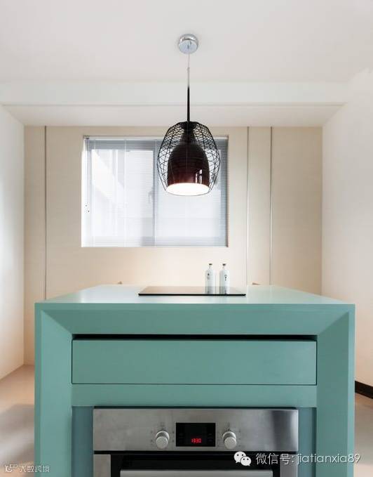 以硅藻泥与金属饰线为立面造型,湖水绿的中岛吧台衔接餐桌,补充房地产商简附厨具之外的电器收纳等功能需求。