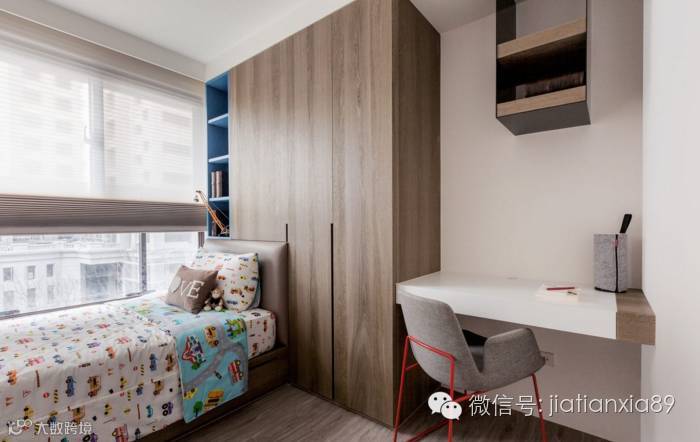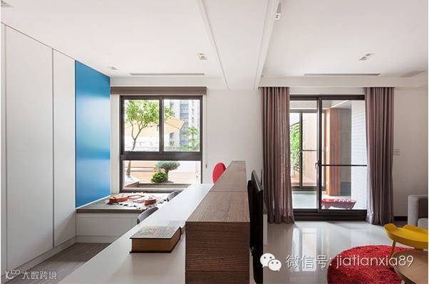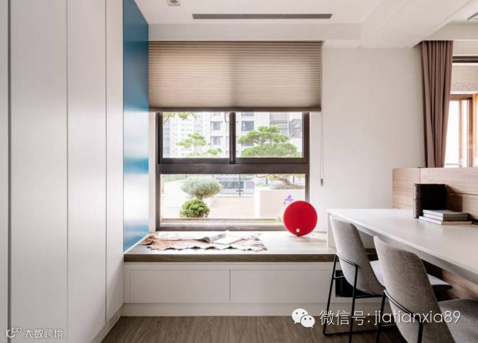 设计者以衣柜与收纳共构的隔间量体取代书房与主卧的实体隔间,收纳功能更贴近使用需求,窗边卧榻旁的收纳立面,将户外景色导入室内。