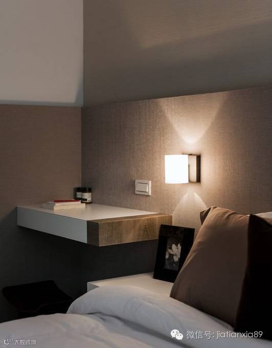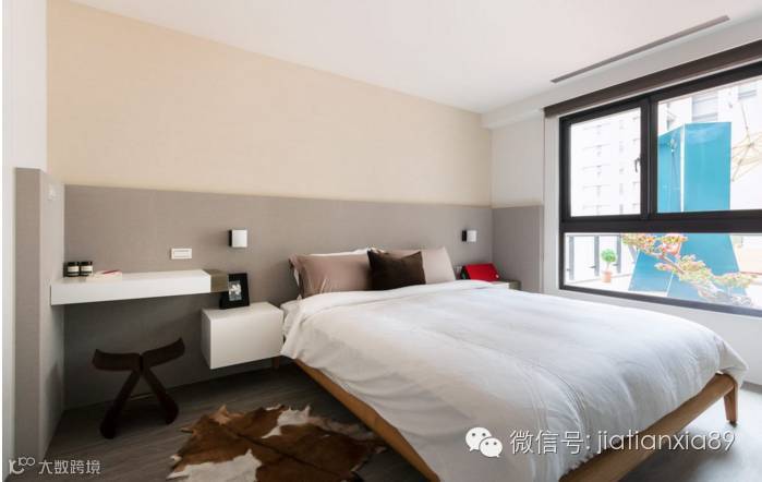 硅藻泥与壁纸为简约利落的主卧空间,做了舒适比例的视觉切割。