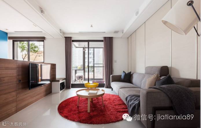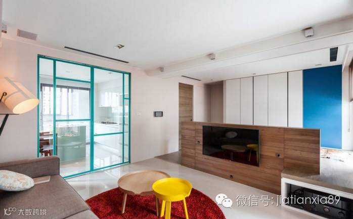 设计者利用湖水绿框线的分割造型,为客厅与餐厨的分野,搭起贯穿空间的光线桥梁。