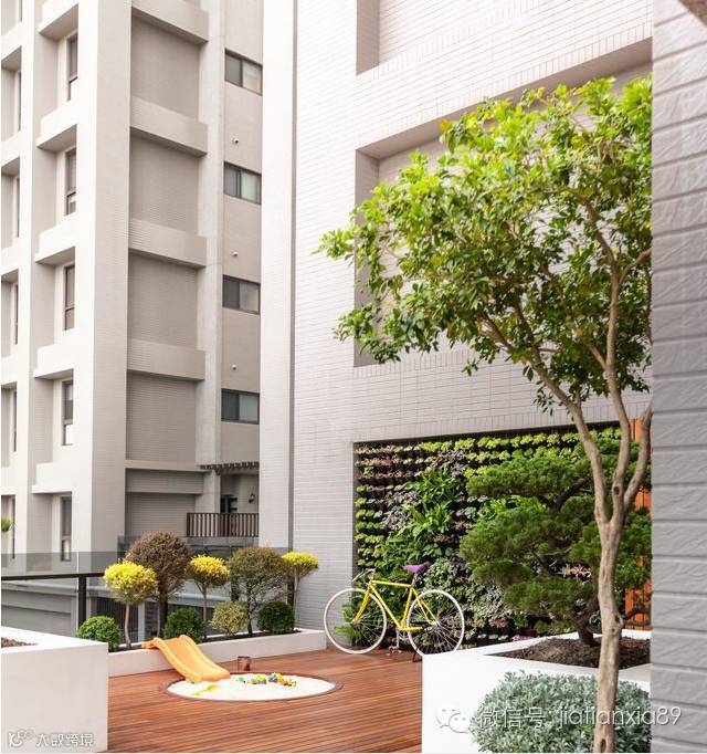 踏入露台,以植物墙为冰冷的建筑量体添上亲切的绿意表情。