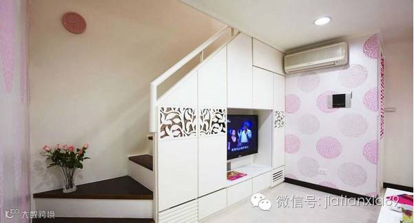 沙发对面的电视背景墙美观又实用,上面镂空的雕花婉约柔美,梯形的造型与跃层的设计相契合,楼梯上花束的装点让这里在不经意间也成为了家中一道亮丽的风景线。