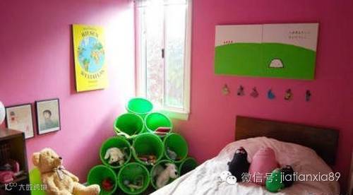 粉色的儿童房背景墙用温馨浪漫的色彩为孩子烘托出一间充满梦幻色彩的成长空间,一个个大小不一的塑料桶堆砌在儿童房的一角,这样不仅可以在里面放置一些衣物玩具,而且还成为小户型装修设计中美好的装饰之一。白色的床上用品加上彩色玩具的点缀,给儿童房增添了精彩也成为小户型装修设计的清爽一笔。