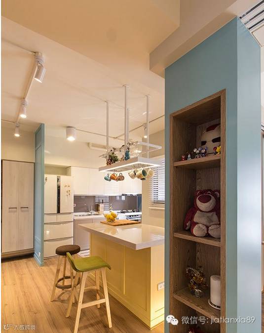 舍弃餐桌的制式配置,以吧台回应女主人的期望;此外,吧台漆上柠檬黄呼应整体调性,下方也纳入足量收纳,赋予多元的功能性。