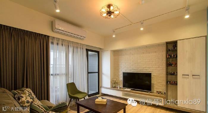 电视墙以文化石为墙底,带出经典的美式韵味;两侧则利用系统柜搭配木作工法,创造更丰富的收纳功能。