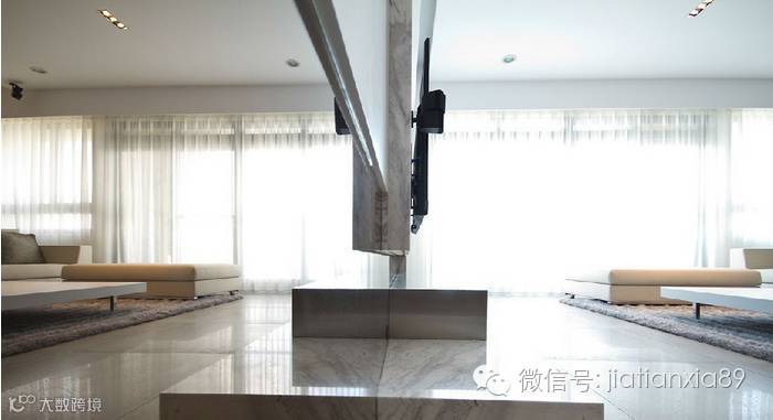 沐浴在光之下的电视主墙,石材的细腻纹理就是最佳的装置元素,局部搭配茶镜与金属矮柜,透过金属的前卫与明亮色彩,展现主人的独到品味。