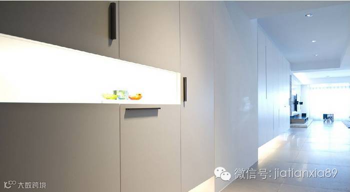 玄关靠墙善用墙面落差分段规划鞋柜和其他收纳,透过柜体腰间的展示格与简敛线条,延伸至客厅主墙面,打造低调的连续美感并淡化实体橱柜的压迫性。