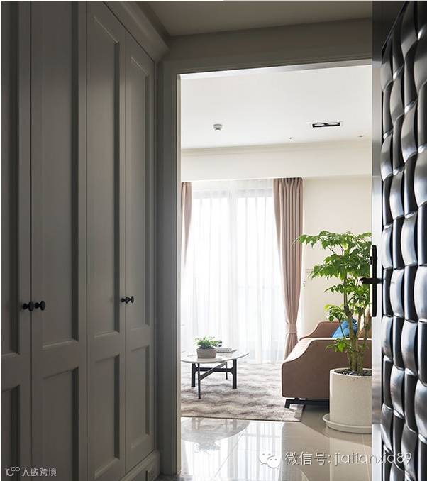 由于公领域不大,因此把开阔度留给了客厅,转而将空间大部分的收纳柜、端景柜集中于走道上,不仅使空间方整开阔,从各个角度望去都可欣赏精致悦目的造景层次。